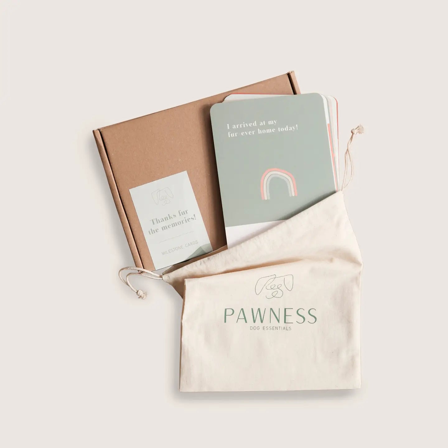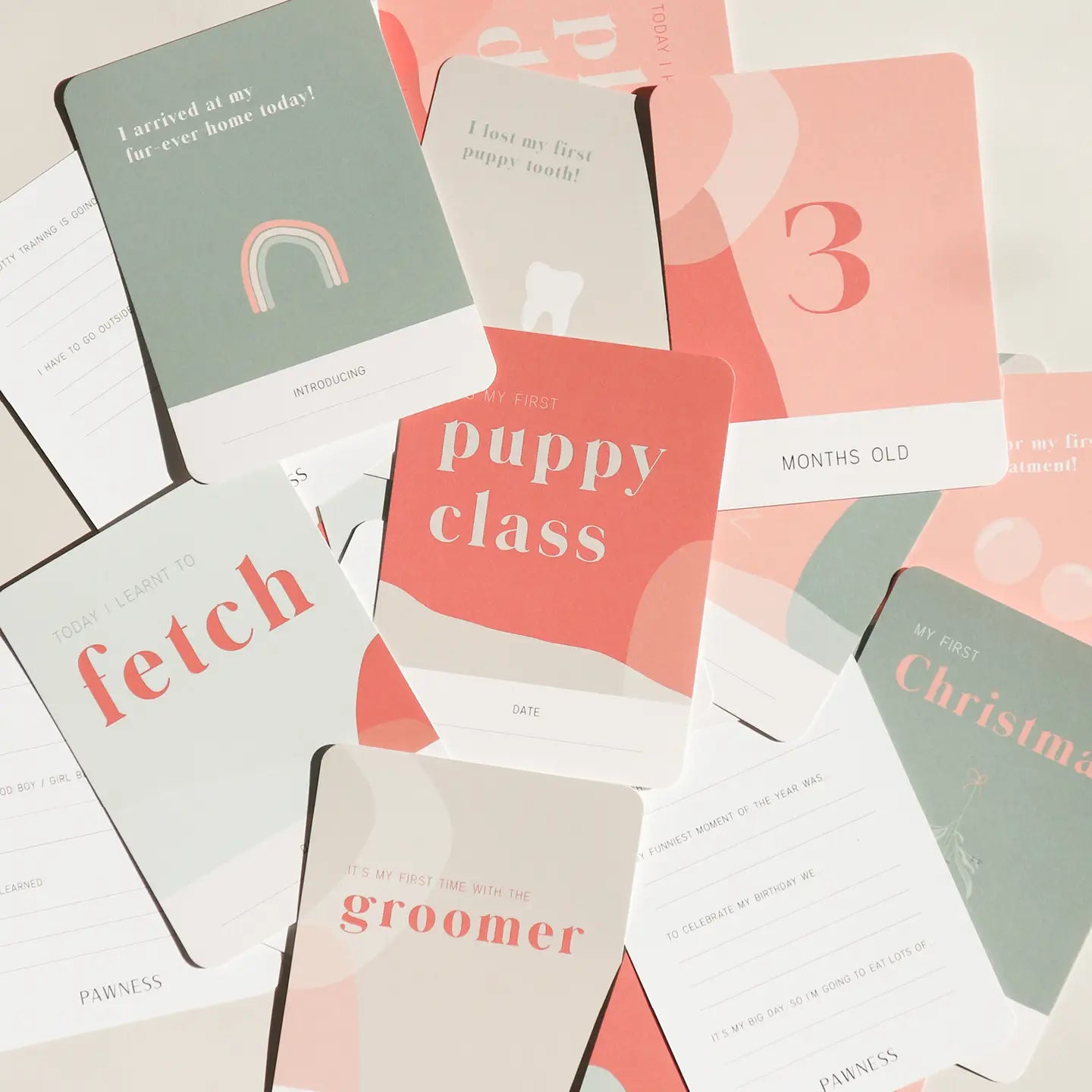 egálate a ti y a tu mejor amigo un conjunto de 20 tarjetas impresas por ambos lados que marcan cada hito canino que puedas imaginar.